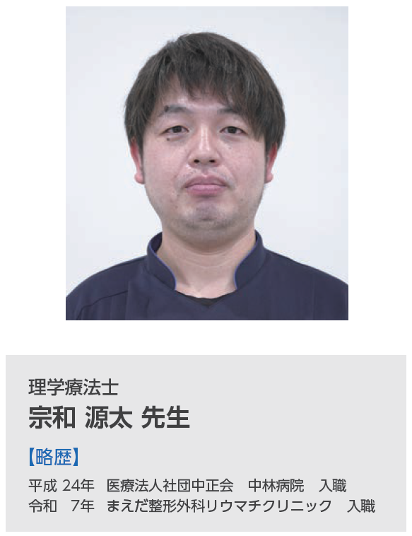 まえだ整形外科リウマチクリニックに理学療法士で務めております、宗和源太と申します。私たち理学療法士は、院長先生の指示のもとでリハビリなどをしていますが、先生がすべてを把握しきれない患者さんの病態などをしっかりと評価し、その結果を治療に活かすことをいちばん大切にしています。その一方で、患者さんには、できるだけリラックスした状態で治療を受けてもらいたいと思っていて、リハビリの現場で患者さんに接するときは、できるだけ堅苦しくならないように心掛け、ユーモアのある会話を交えて、患者さんが思わず “クスっと” 笑ってもらえるような、安心して治療をうけていただける雰囲気づくりに努めています。