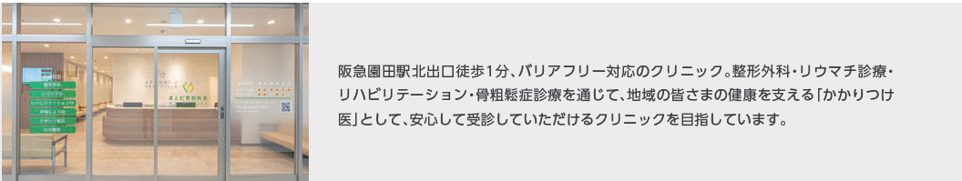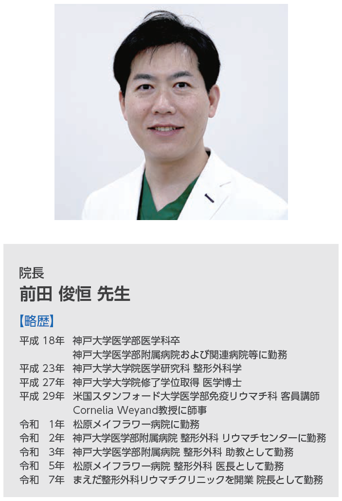 まえだ整形外科リウマチクリニック院長の前田俊恒と申します。当院は、兵庫県尼崎市にある整形外科クリニックで、阪急園田駅から徒歩1分という非常に便利な場所にあります。当院では、一般的な整形外科診療はもちろん、関節リウマチや骨粗鬆症といった慢性疾患、さらに怪我や切り傷などの処置にも対応しています。また、院内にリハビリ室を備え、リハビリテーションにも力を入れており、患者さんの健康寿命をトータルにサポートする医療を心がけています。