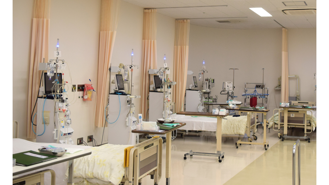 当院の患者さんは60歳以上の高齢者が中心で、地域の他の透析を導入されている病院で診られなくなった患者さんや、独歩では通えない方も引き受けています。当院は、リハビリ施設もあり、地域の基幹病院として多くの患者さんを受け入れる体制が出来ています。