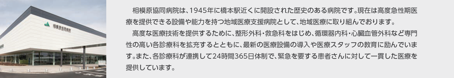相模原協同病院は、1945年8月に相模原北部の無医村を解消する目的で開院し、以来地域の皆様と共にその歴史を刻んできました。